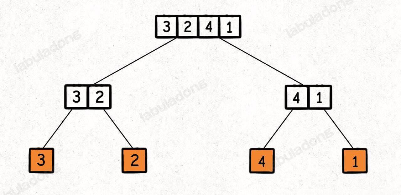 归并排序的核心思路需要结合二叉树的后序遍历 来理解:先利用递归把左右两半子数组排好序,然后在二叉树的后序位置合并两个有序数组。